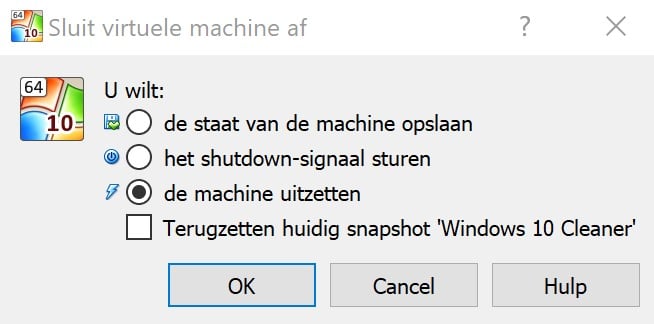 Pour éteindre la machine virtuelle, cliquez sur la croix dans la barre des tâches. Trois choix s’offrent à vous : enregistrer l’état pour reprendre plus tard exactement où vous en étiez, envoyer le signal d’arrêt pour une extinction en douceur (pratique si des mises à jour sont en cours), ou arrêter immédiatement sans sauvegarde. À noter : la fonction d’arrêt peut parfois ne pas fonctionner parfaitement sous Windows 10. Si un instantané est enregistré, vous pourrez également restaurer automatiquement la dernière sauvegarde lors du prochain démarrage.
